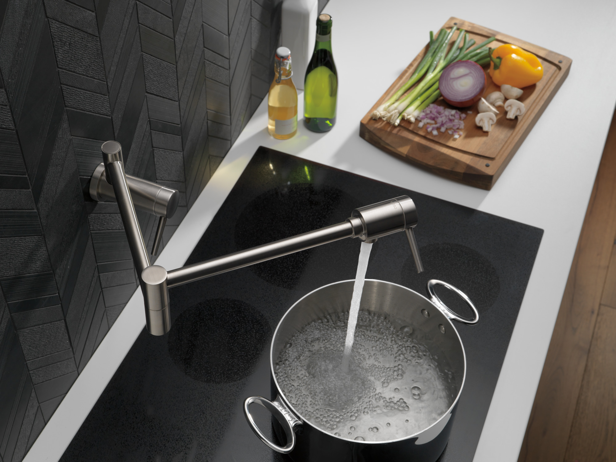 - Dual shut off on the Delta Pot Filler faucet allows the user to turn the water off at either the wall or the spout, controlling the water flow at the point of use
