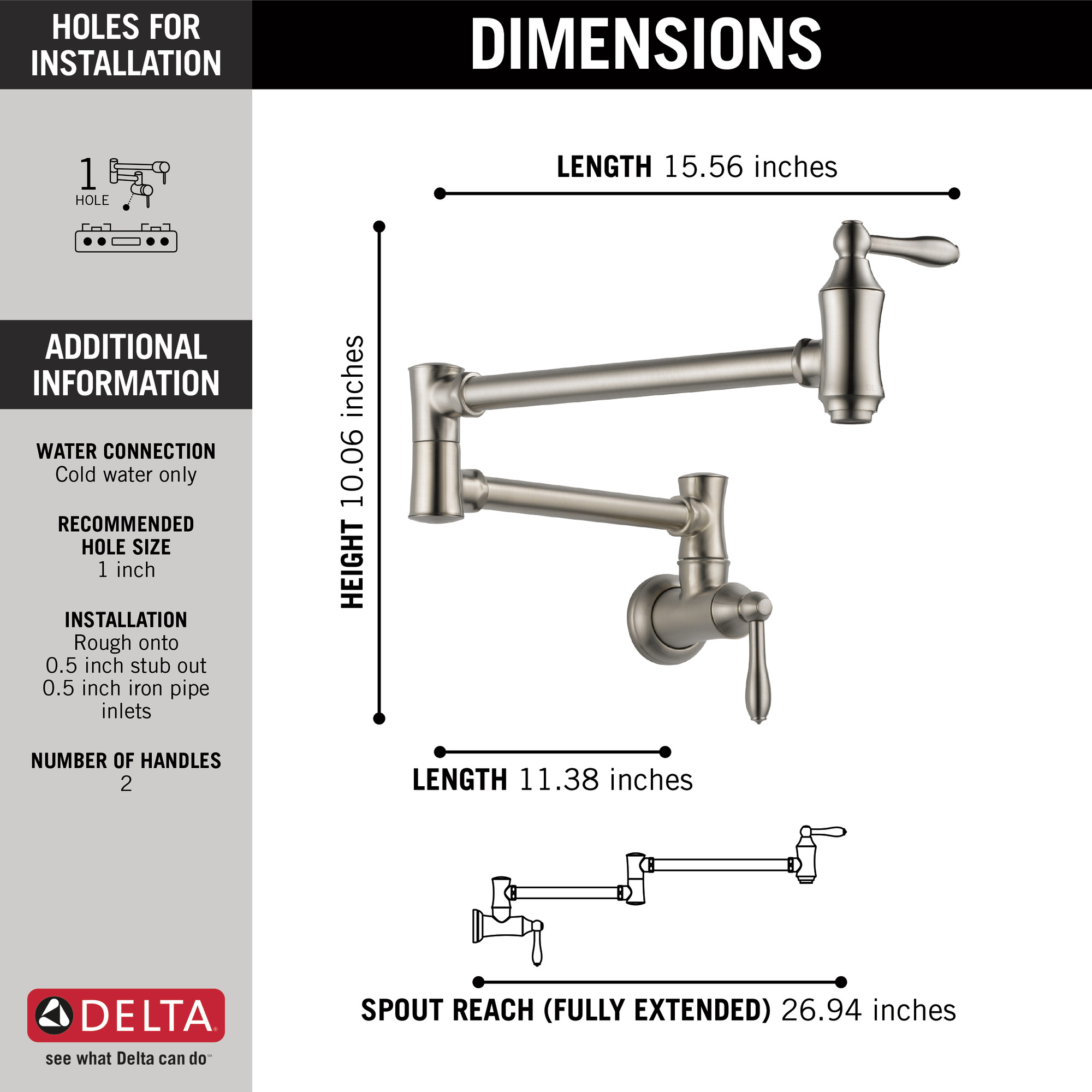 - Dual shut off on the Delta Pot Filler faucet allows the user to turn the water off at either the wall or the spout, controlling the water flow at the point of use