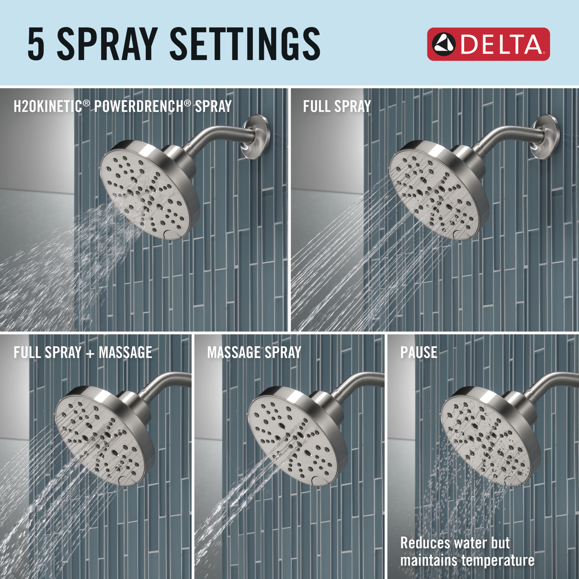 - H2Okinetic® Shower technology sculpts water into a unique wave pattern, forming a powerful drench spray