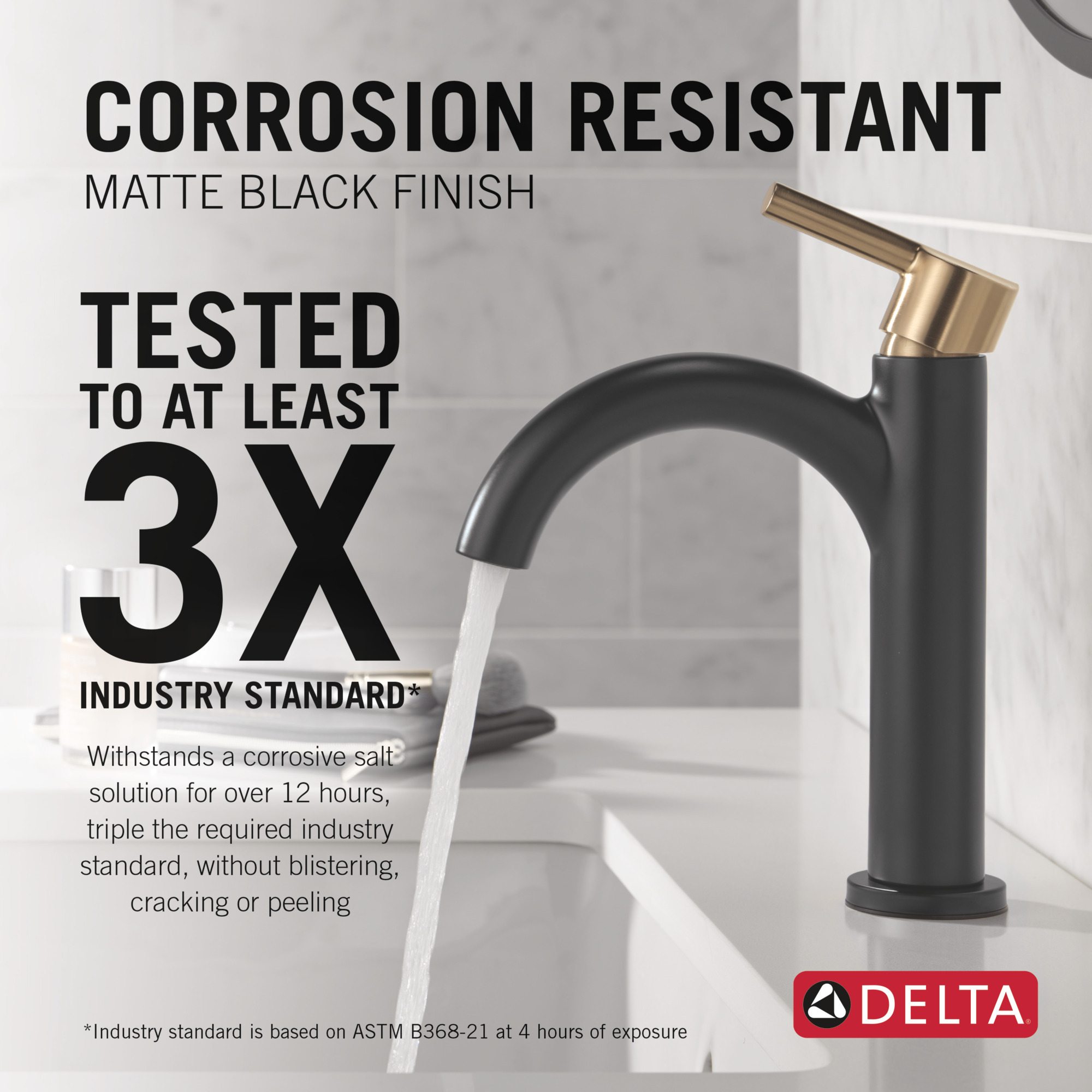 - Delta® Matte Black faucet finishes are salt fog tested, meaning they withstand a corrosive, chemical solution for over 12 hours, triple the required industry standard, without blistering, cracking or peeling