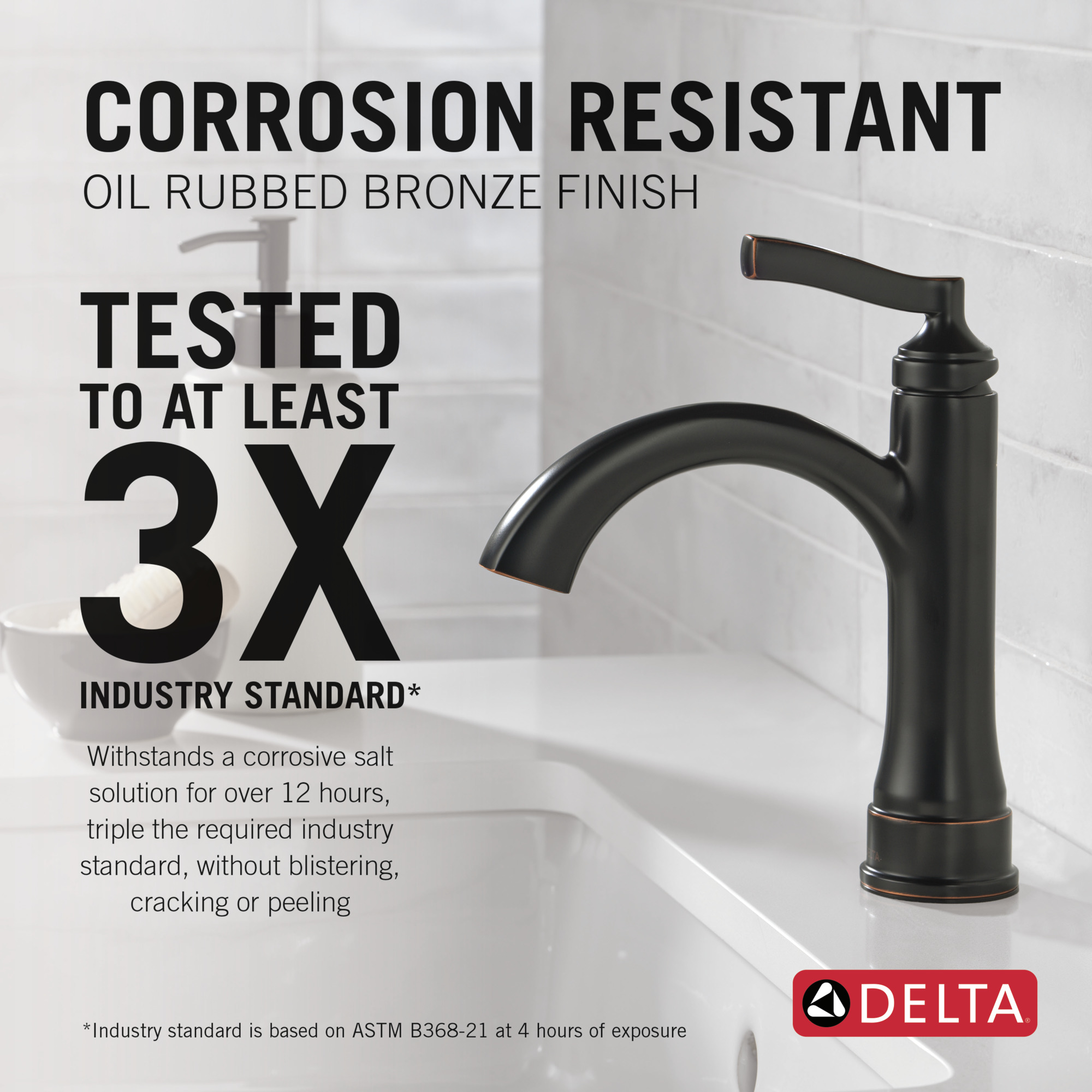 - Oil Rubbed Bronze bathroom faucet surface is tested to withstand 16 hours of exposure to 7 harsh cleaning chemicals without corroding or discoloring.