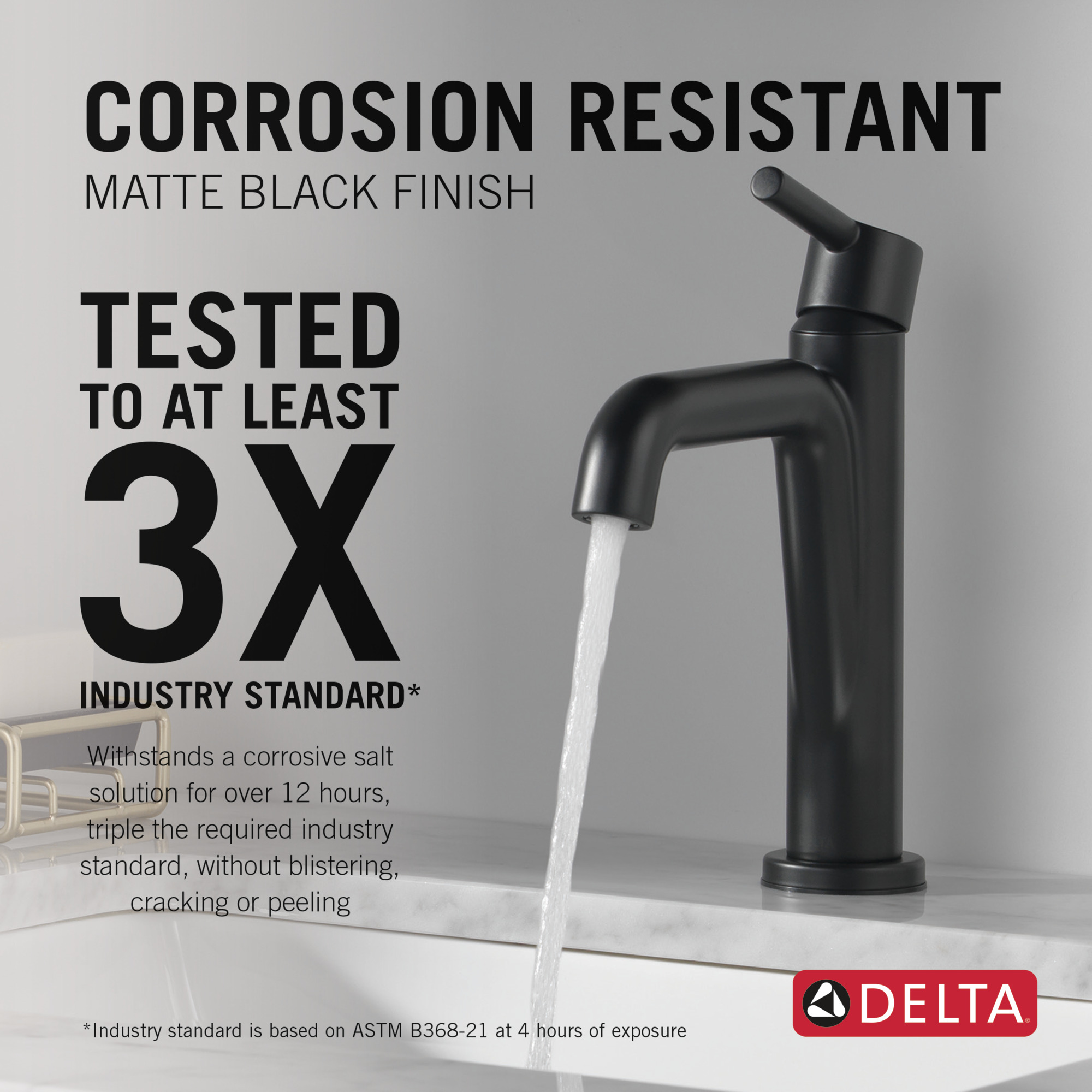 - Delta® Matte Black faucet finishes are salt fog tested, meaning they withstand a corrosive, chemical solution for over 12 hours, triple the required industry standard, without blistering, cracking or peeling