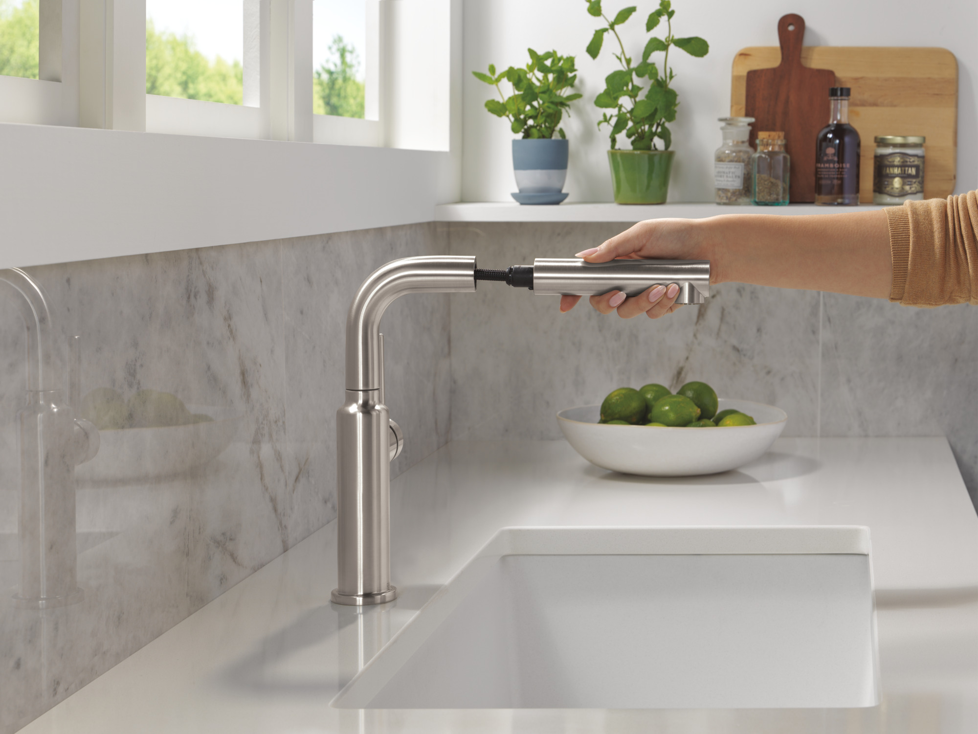 - Soft, rubber Touch-Clean® spray holes allow you to easily wipe away calcium and lime buildup with the touch of a finger