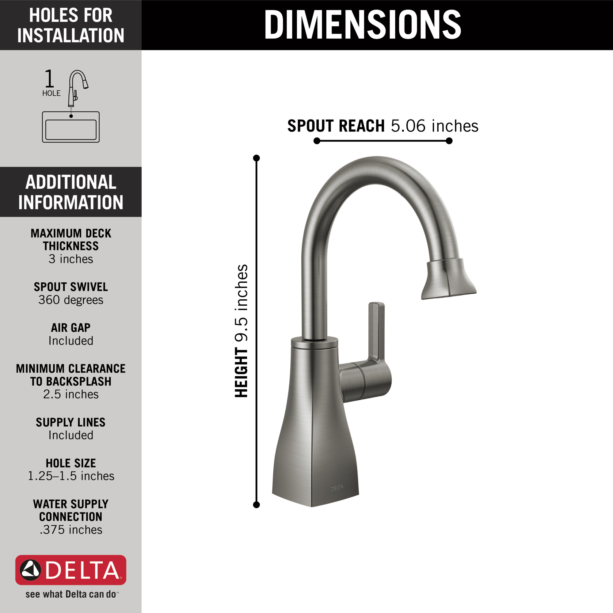 - Air gap included with 1/4 in. tube for RO system and 3/8 in. tube for drain