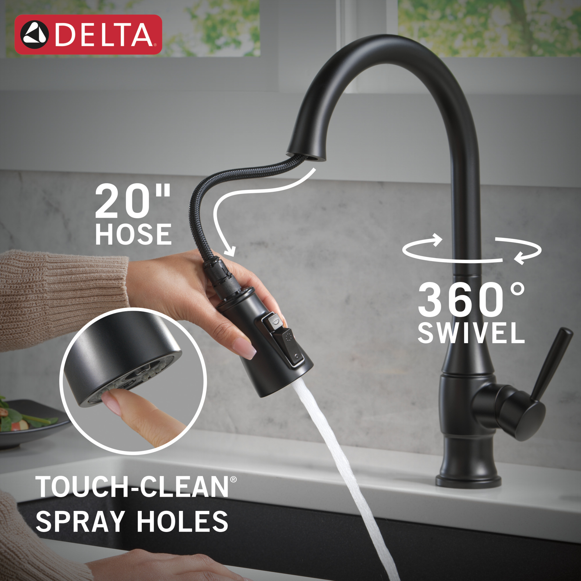 - Soft, rubber Touch-Clean® spray holes allow you to easily wipe away calcium and lime buildup with the touch of a finger