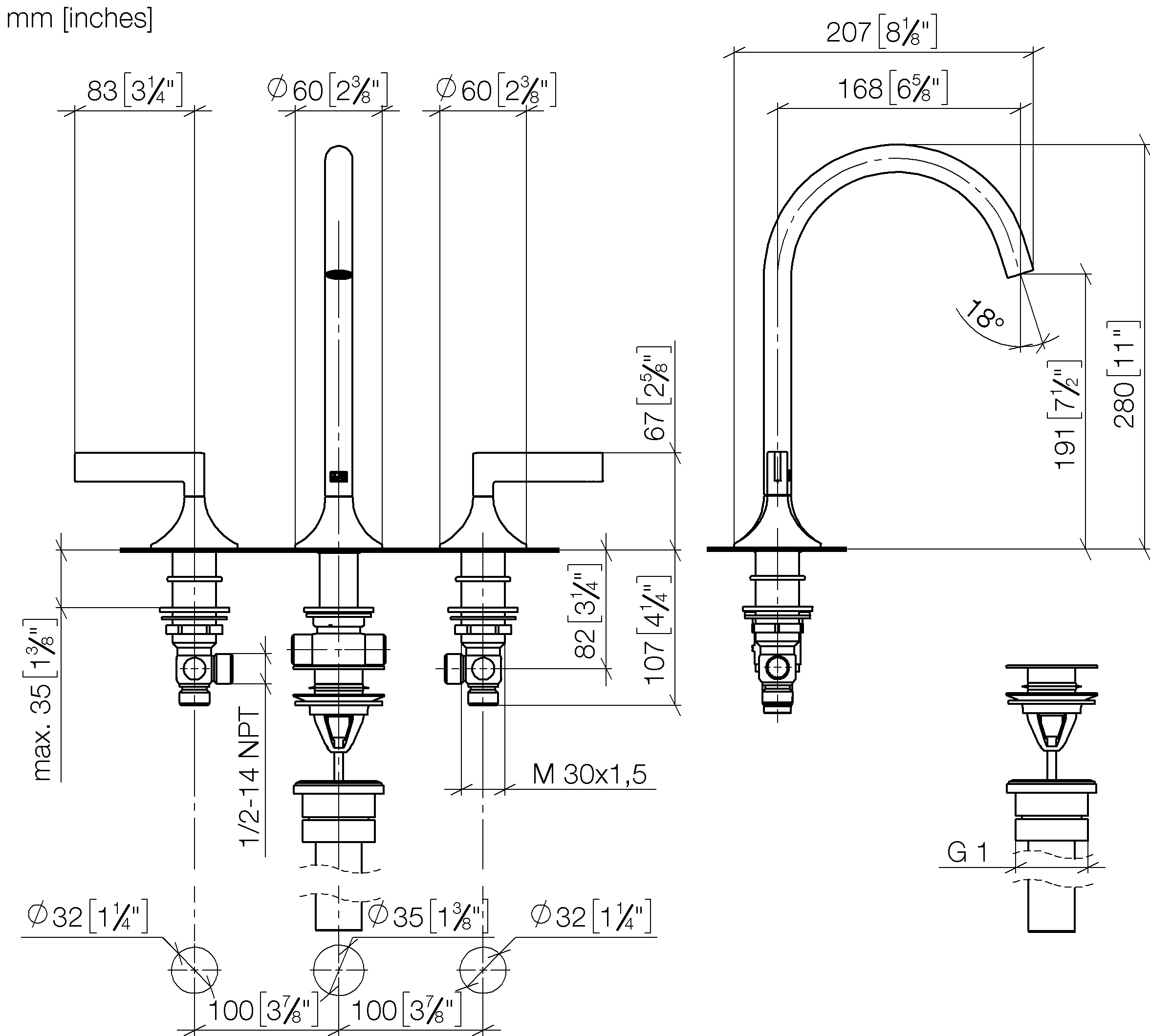 VAIA Three-hole lavatory mixer with drain - Platinum