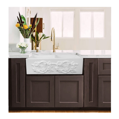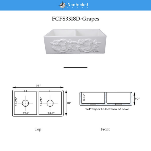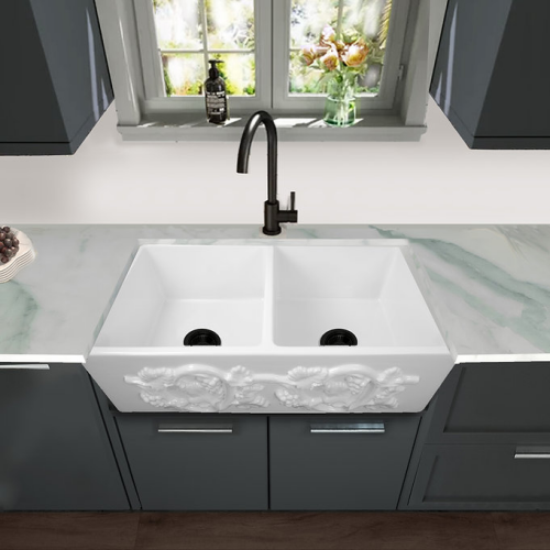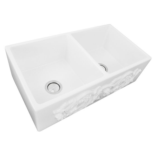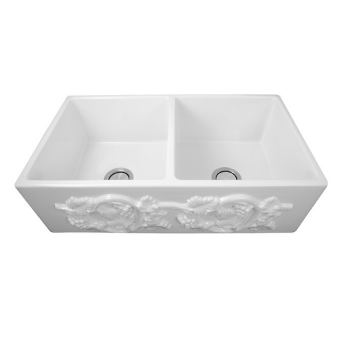Vineyard Collection - 33 Inch Double Bowl Farmhouse Fireclay Sink with Grape Vine Apron